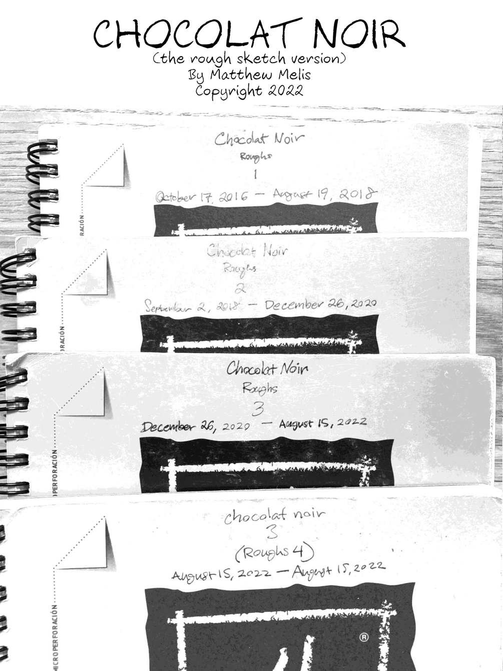 The rough sketches for my first graphic novel, Chocolat Noir. A 357 page, B&W PDF made directly from my sketchbook.